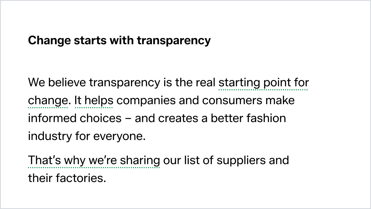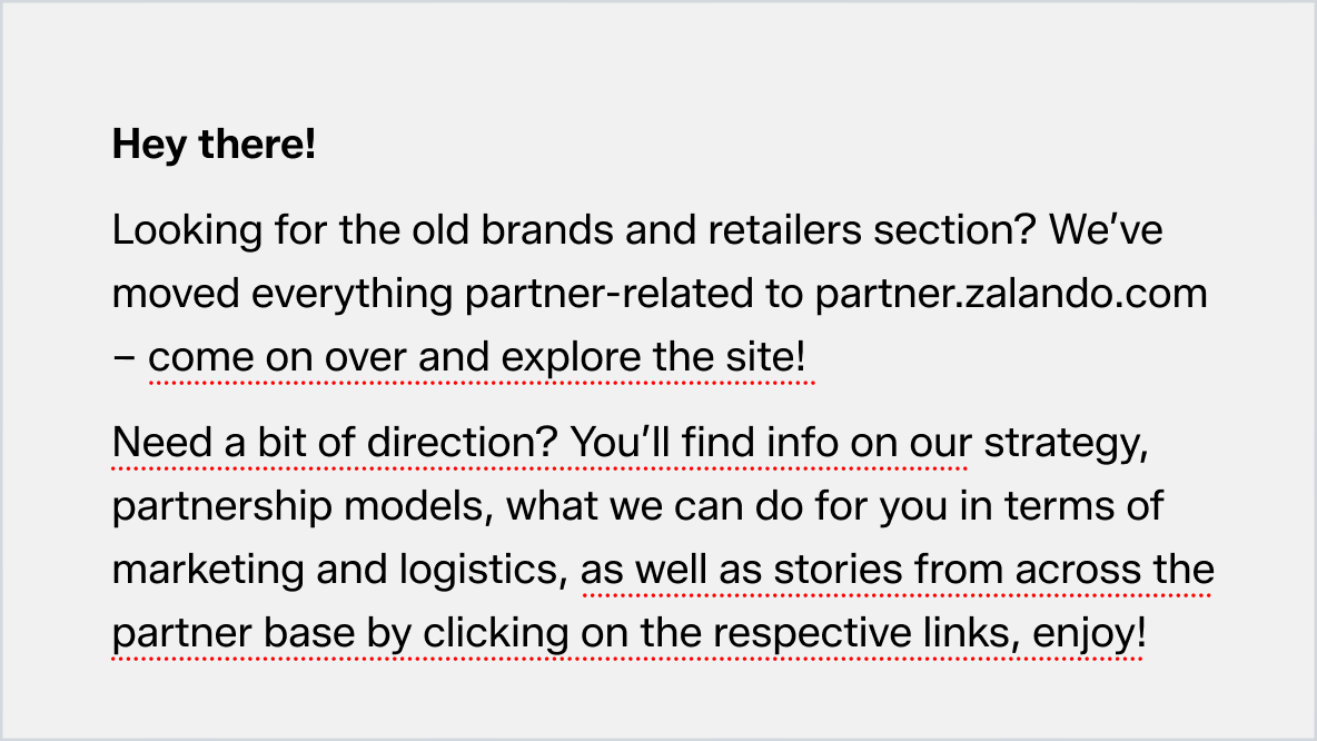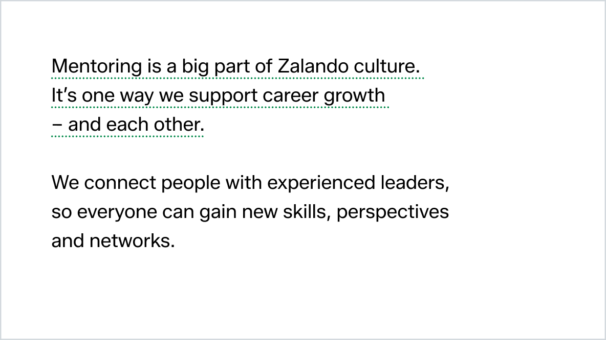 There are a few exceptions: we use the third-person for press releases, legal documents, or to refer to the company e.g. ‘Explore your career opportunities at Zalando.’