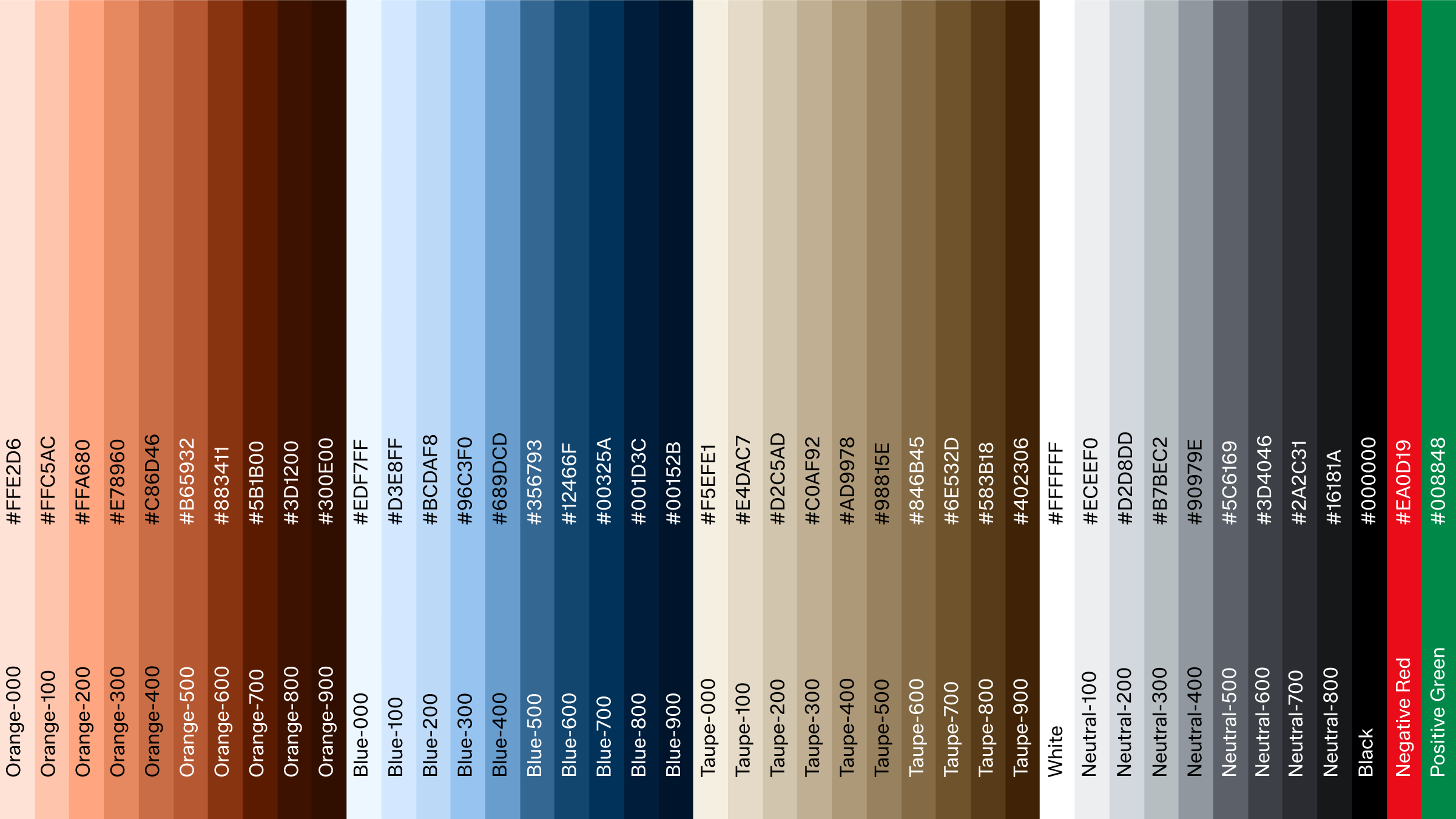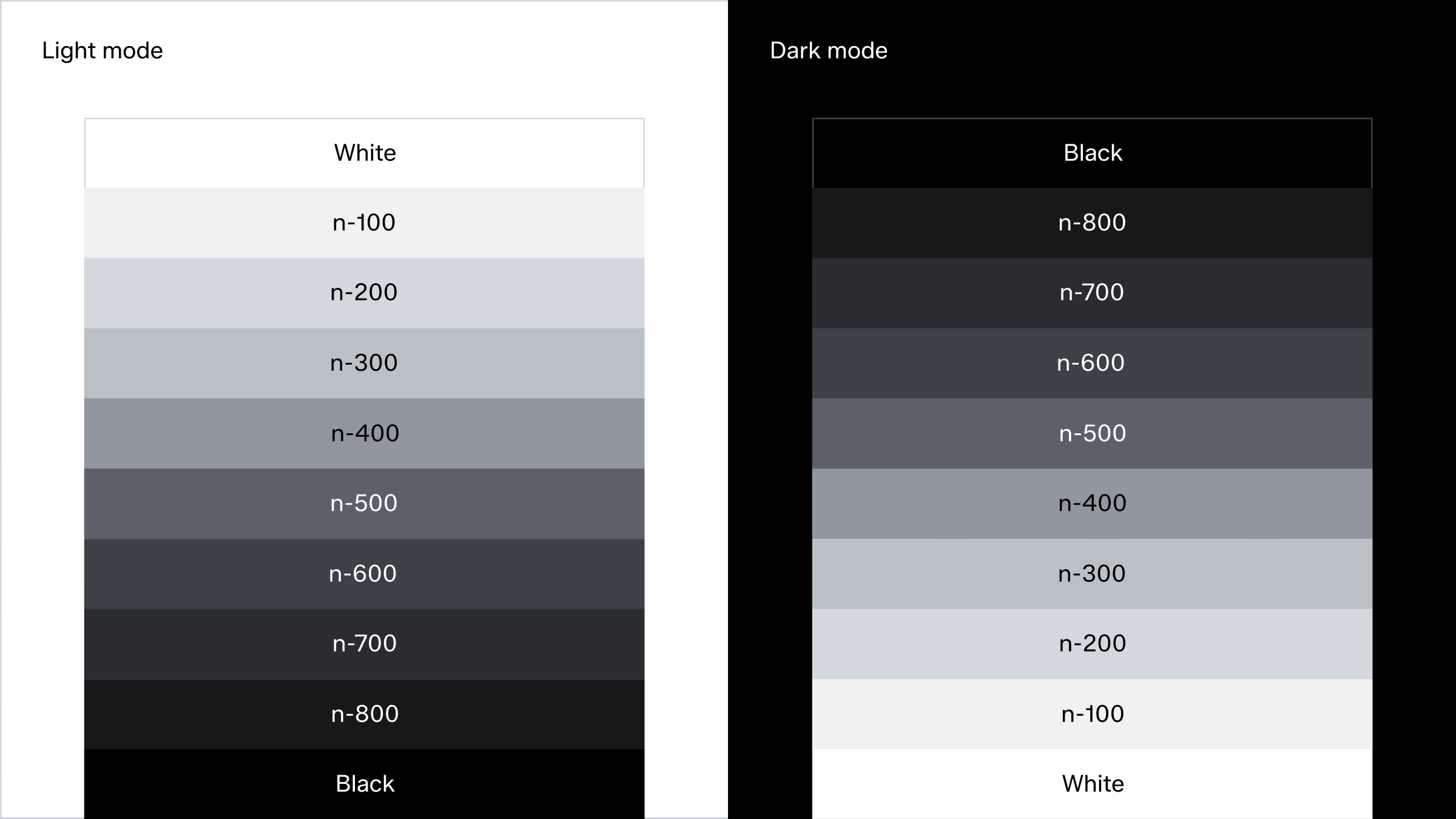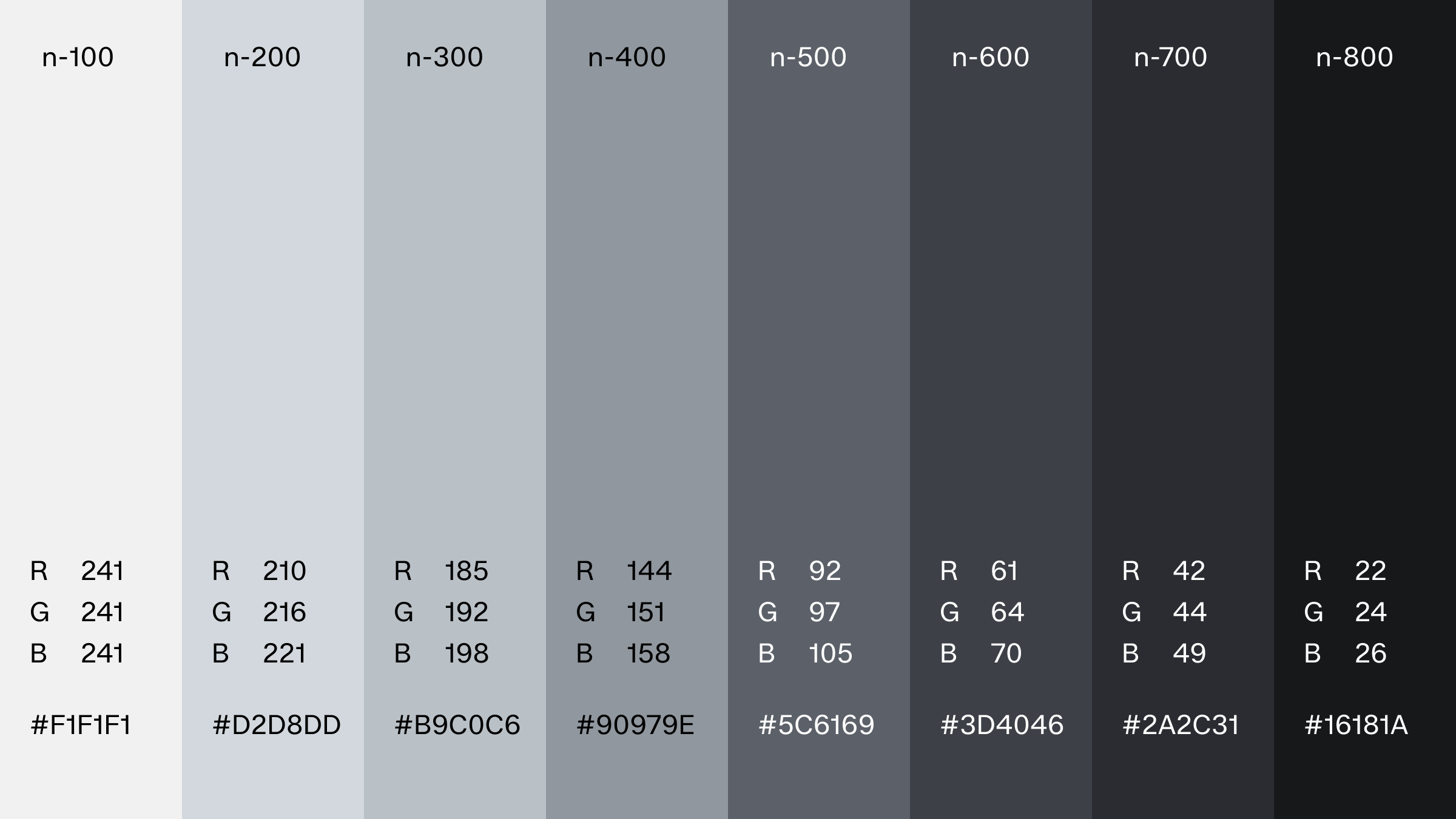 The neutral palette is a great tool when developing UI-elements, alternative text and as supporting background shades to elevate product or images. Each step is equally balanced and can be used for both light and dark mode. The same grayscale works effectively in both light and dark modes by reversing the sequence.