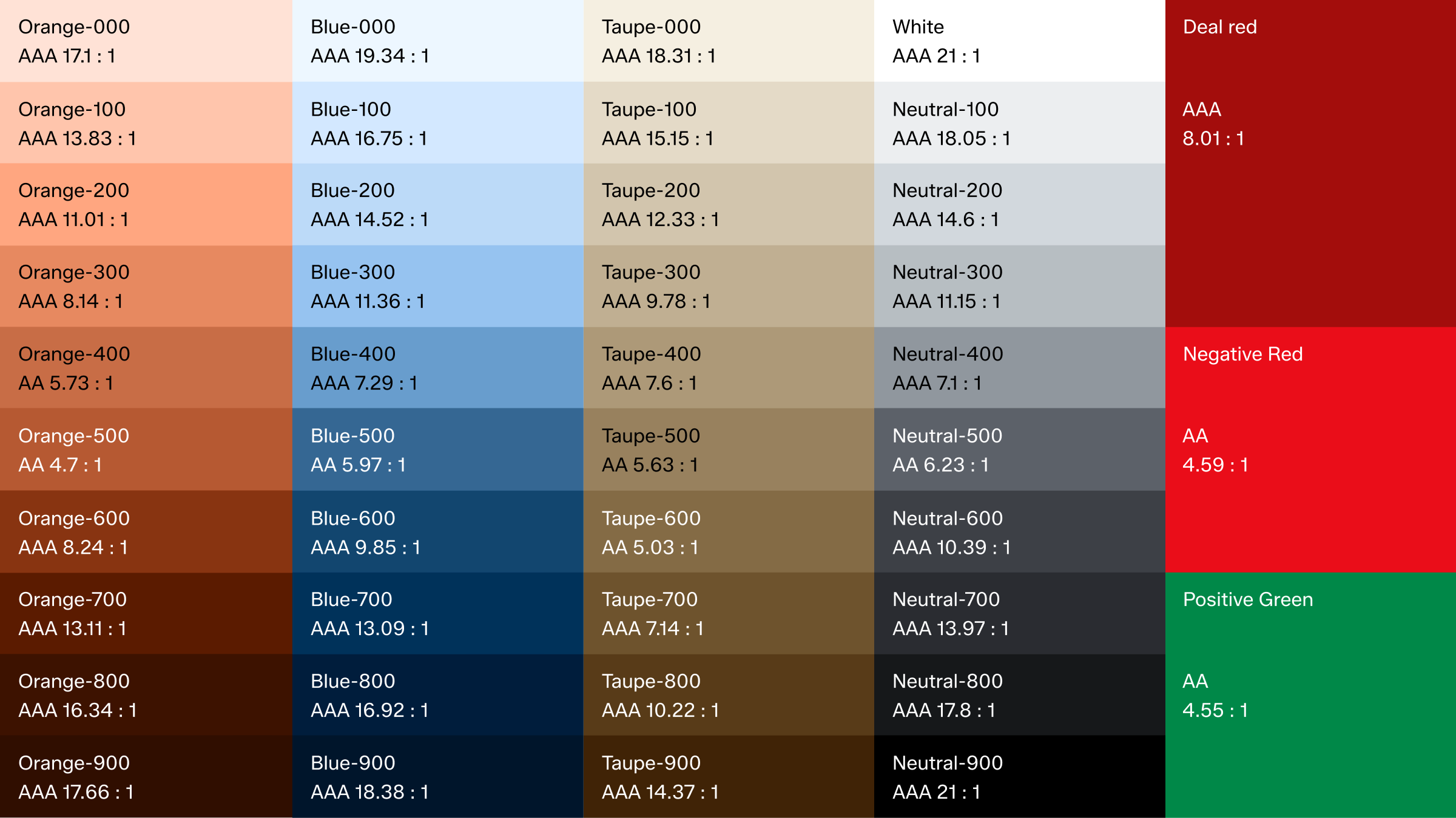 These are the contrast ratios for our primary palette, based on the Web Content Accessibility Guidelines (WCAG).