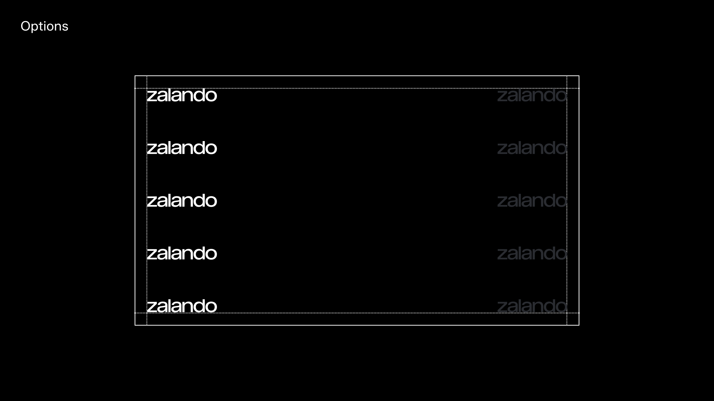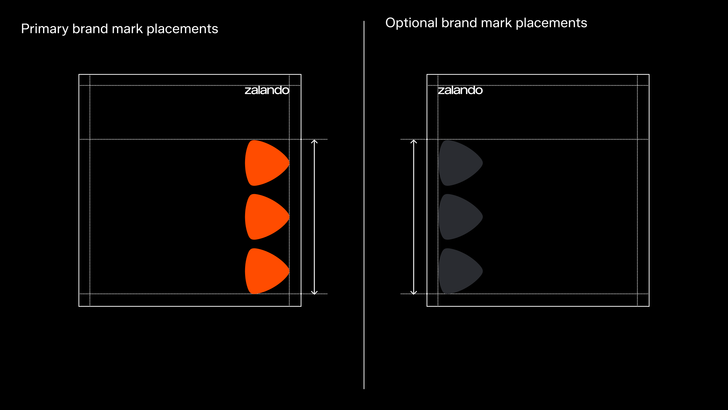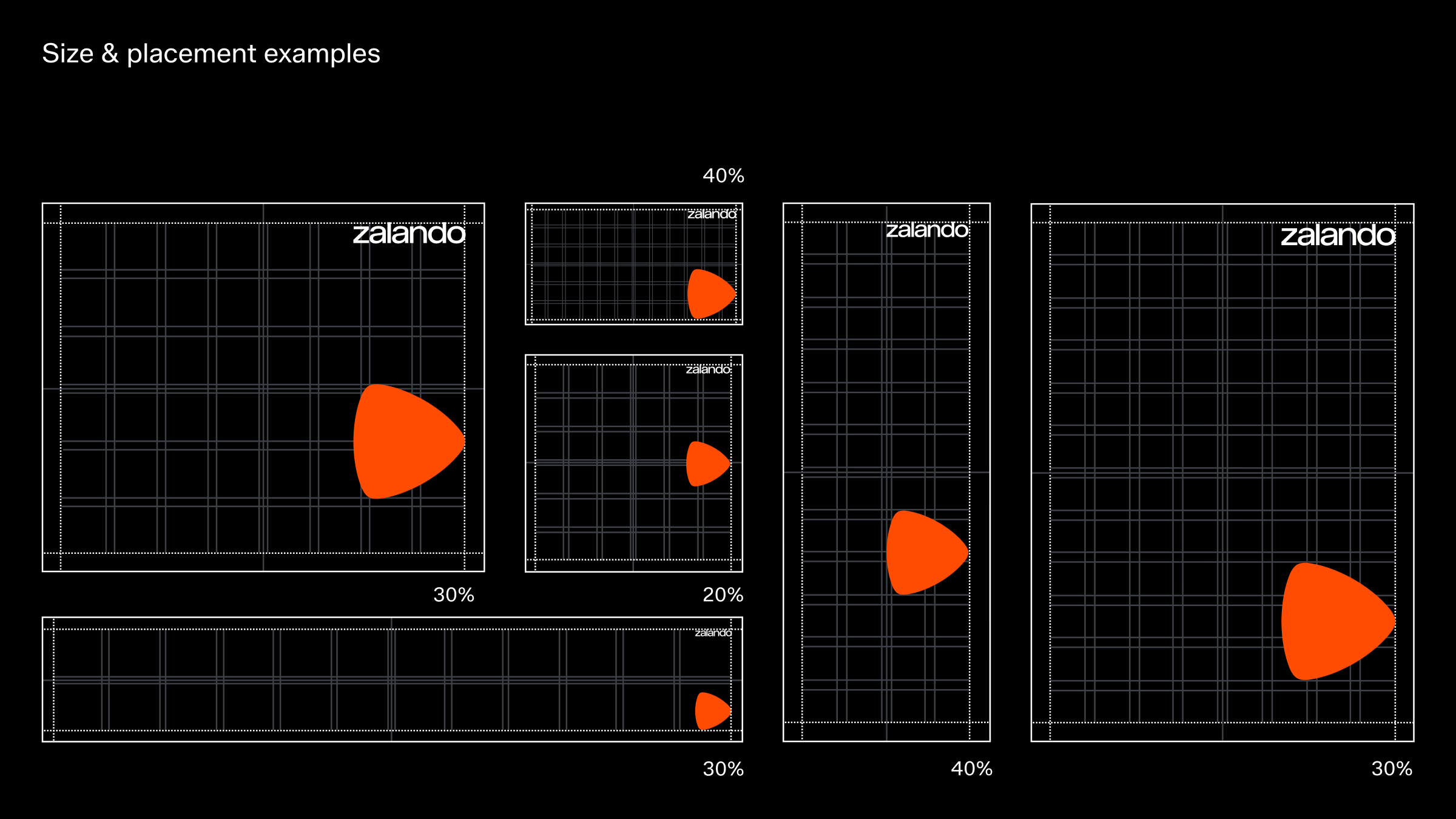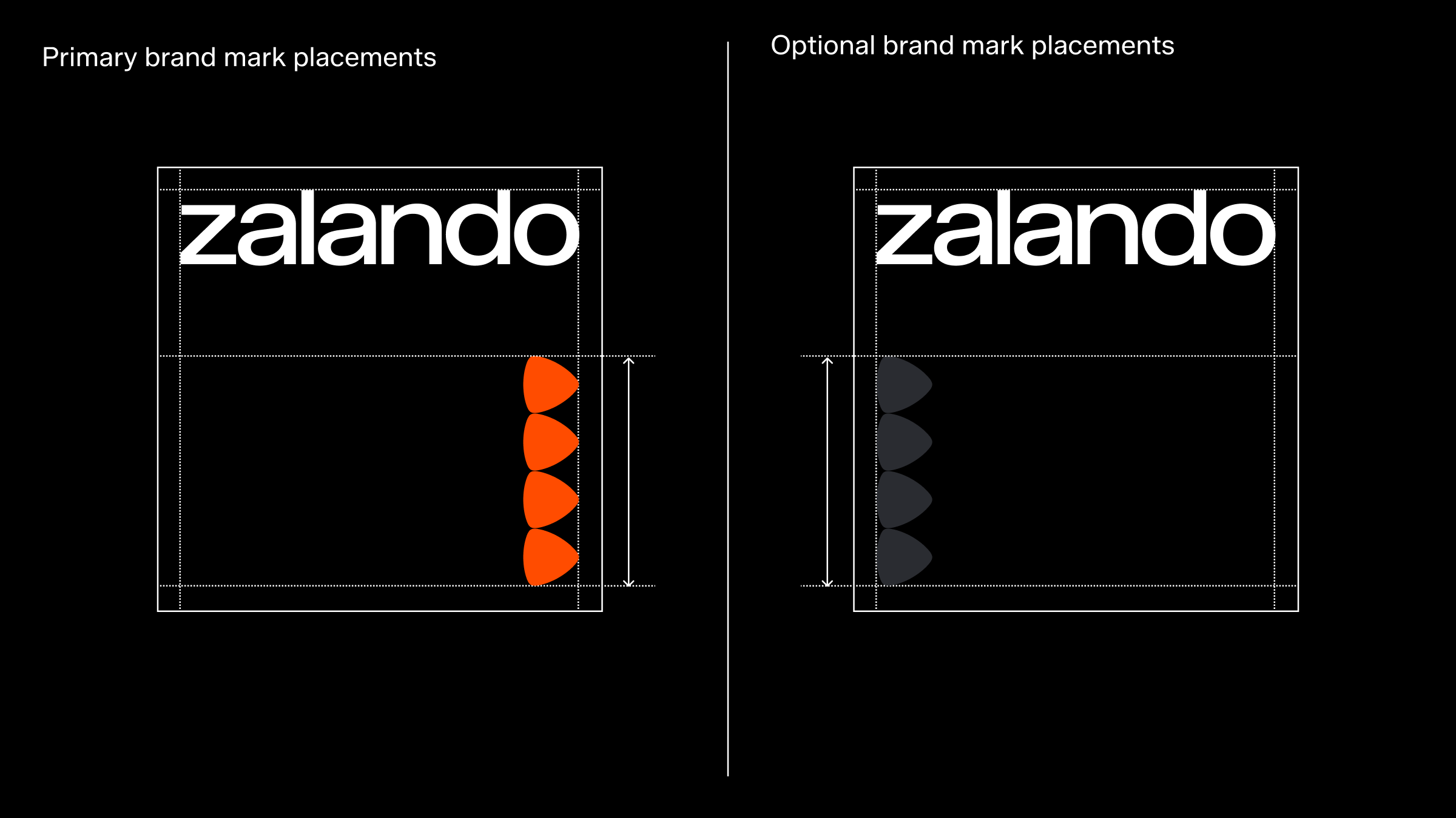 The Zalando brand mark and word mark should not be combined as a fixed lock-up. This rule applies to all formats and must be consistently observed when applying the assets to any design. While both elements can appear on the same surface, they must always be placed separately. (We realise zalando.de still carries a lock-up and are working to remove this exception)A flexible logo-system