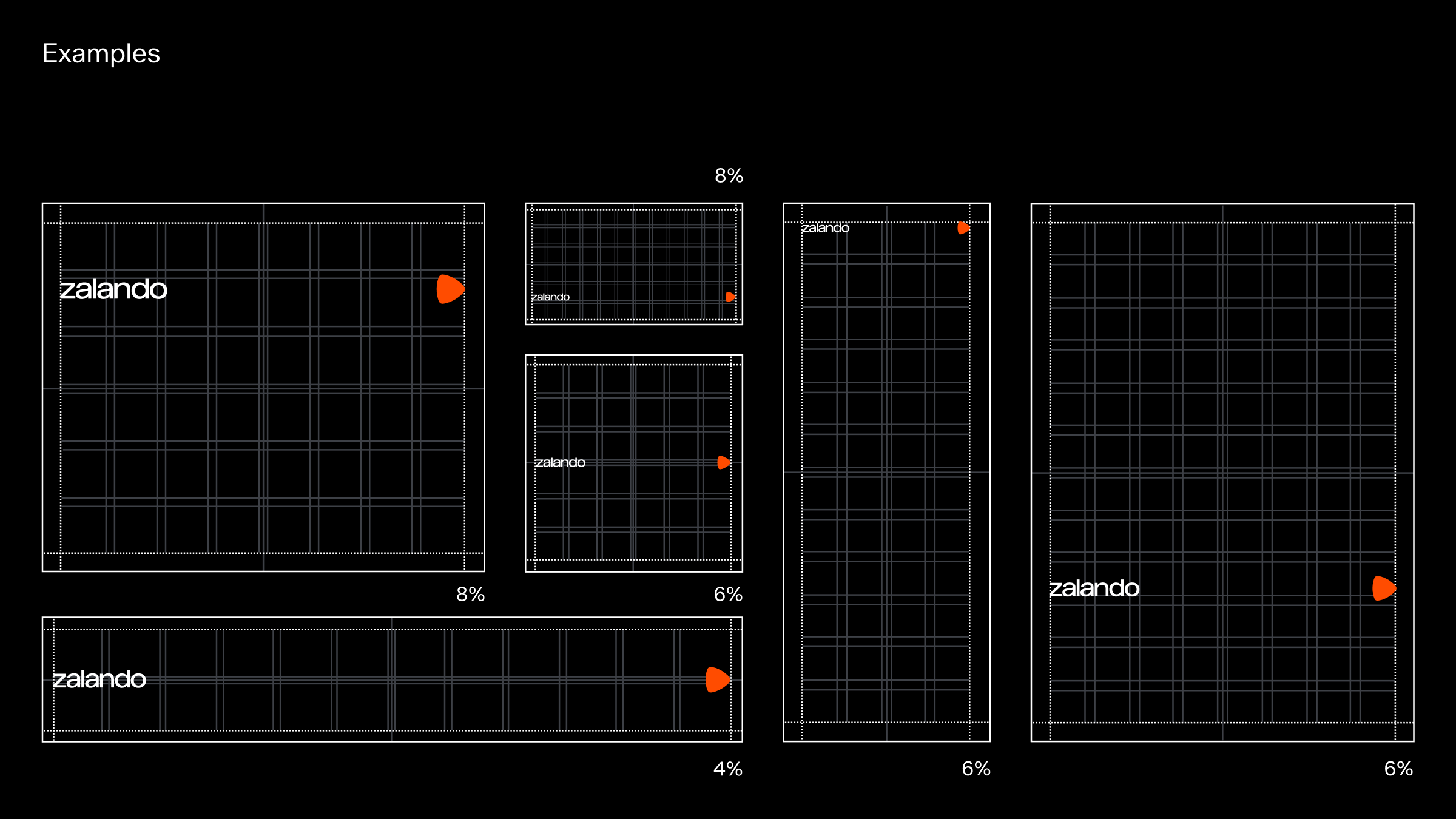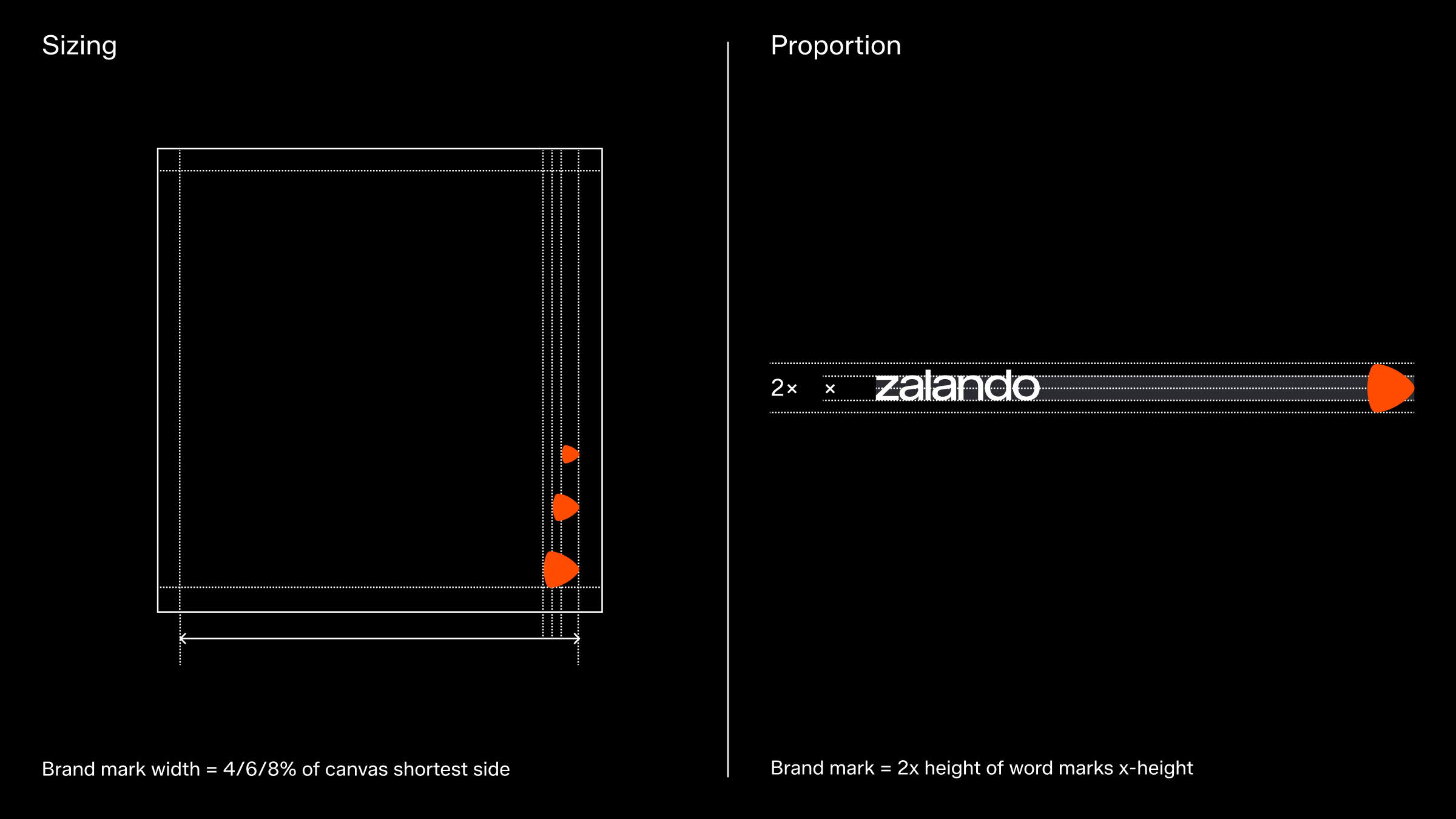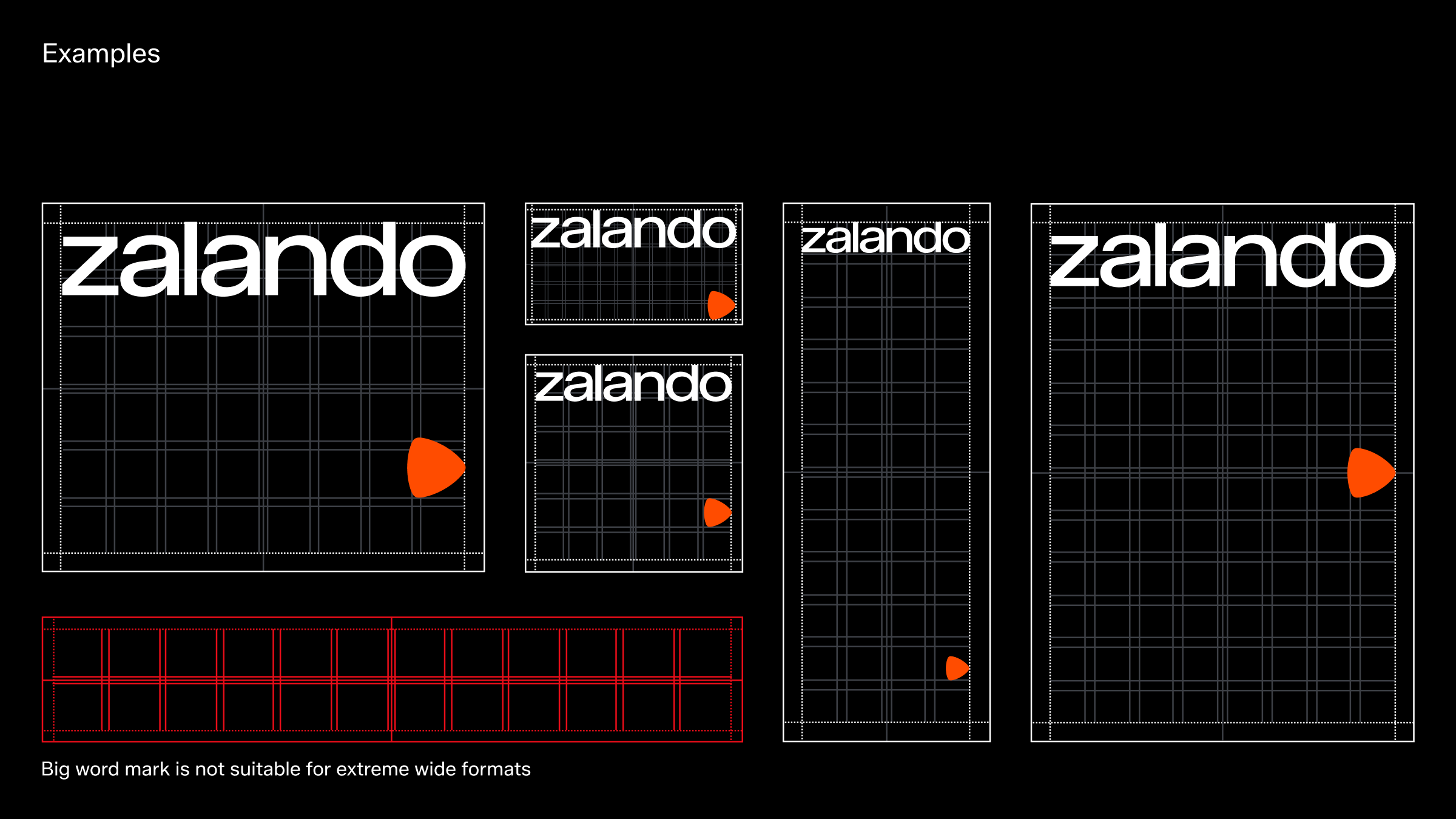 The Zalando brand mark and word mark should not be combined as a fixed lock-up. This rule applies to all formats and must be consistently observed when applying the assets to any design. While both elements can appear on the same surface, they must always be placed separately. (We realise zalando.de still carries a lock-up and are working to remove this exception)A flexible logo-system