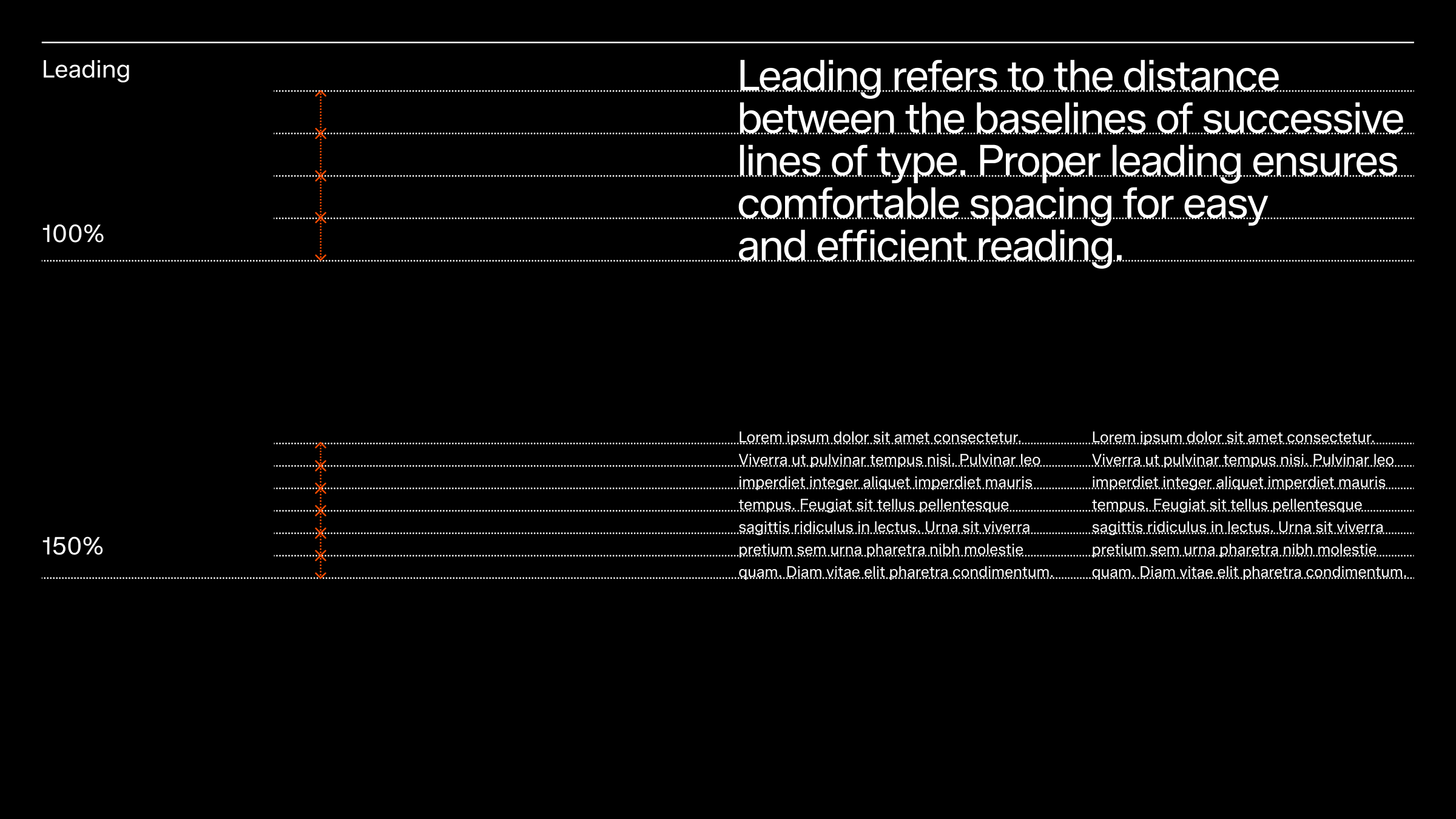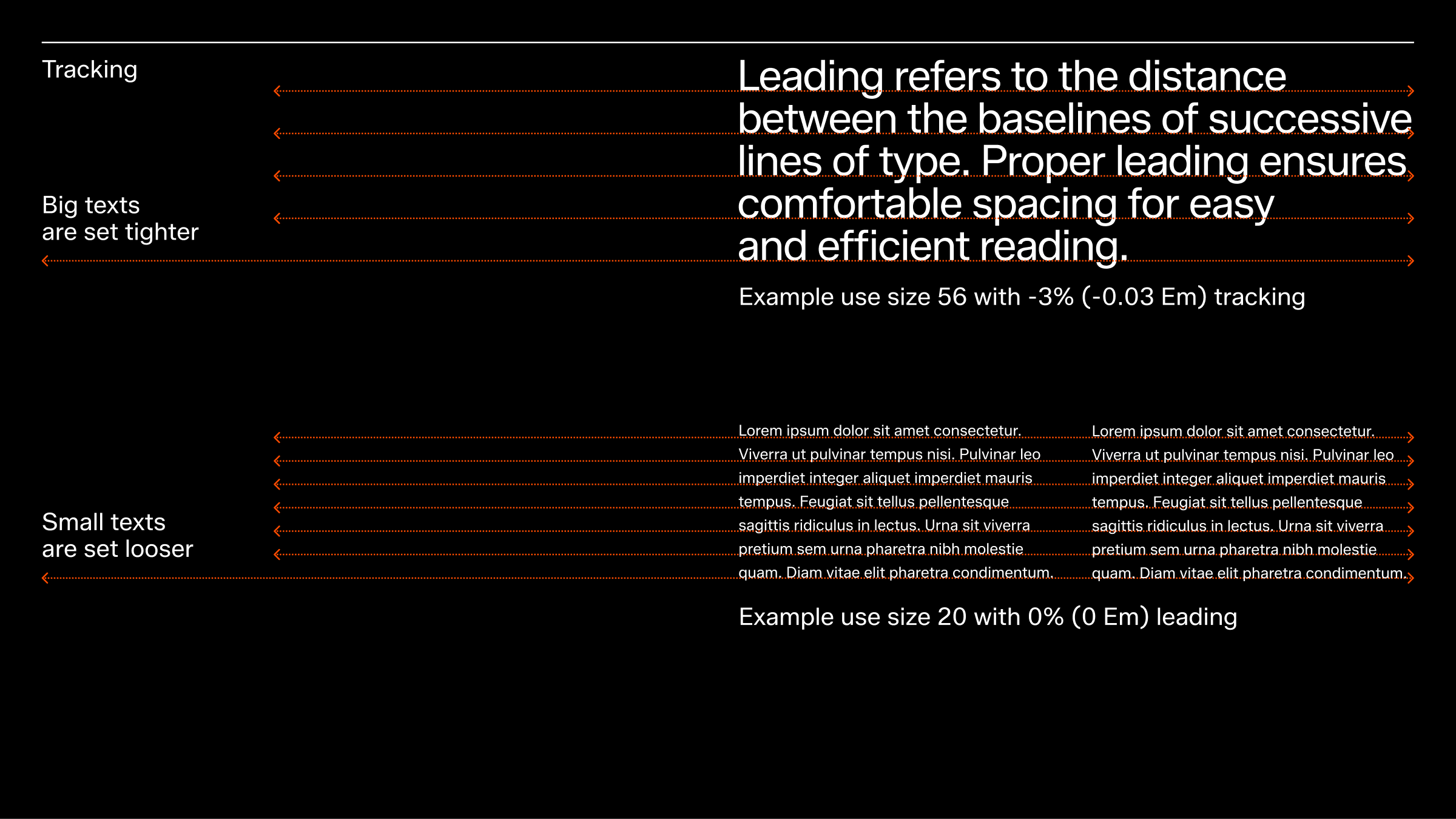 Leading and tracking values should be adjusted according to the text size. For instance, long body copy in a small size may require larger leading and tracking to enhance readability, while headlines in larger text sizes can often use smaller leading and tracking while still maintaining readability. These recommendations are starting points and should be adjusted as needed, such as for on- or off-product applications.