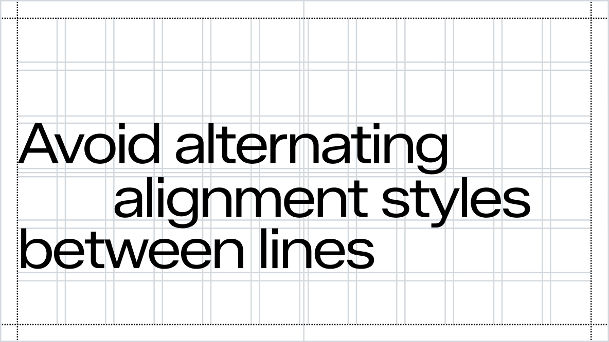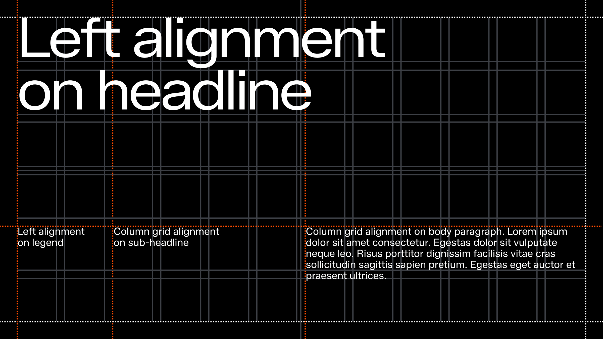Text should primarily be left-aligned. When working with multi-column layouts, ensure that text aligns with the column grid.