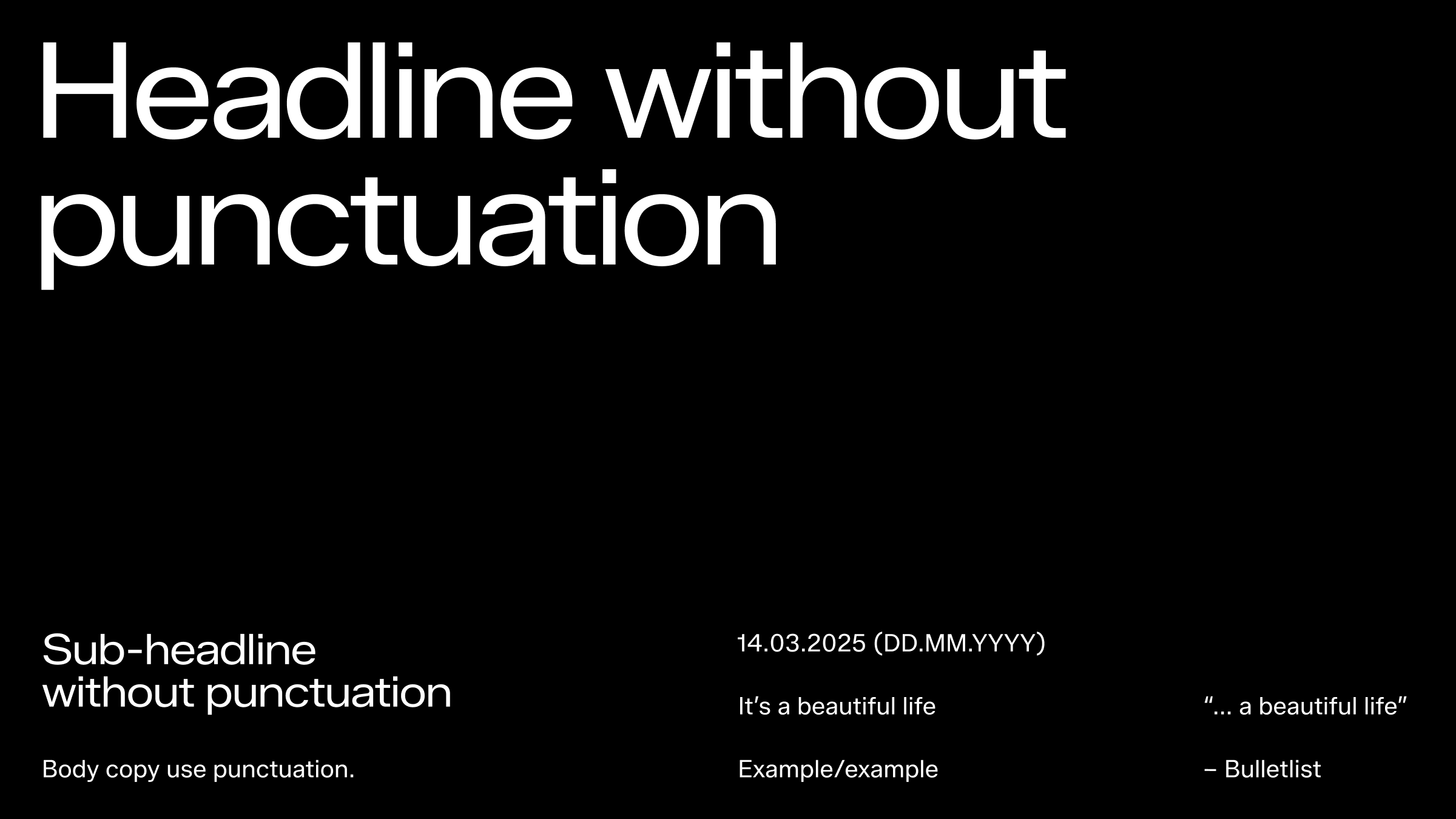 Larger headlines or main messages should be treated as visual elements that harmonise with the content. Additional punctuation, such as commas, colons, or dashes, can create awkward positioning and should generally be avoided. Using sentence case for headlines is sufficient to indicate that multiple lines are part of the same sentence. Below is an overview of common writing rules for Zalando.