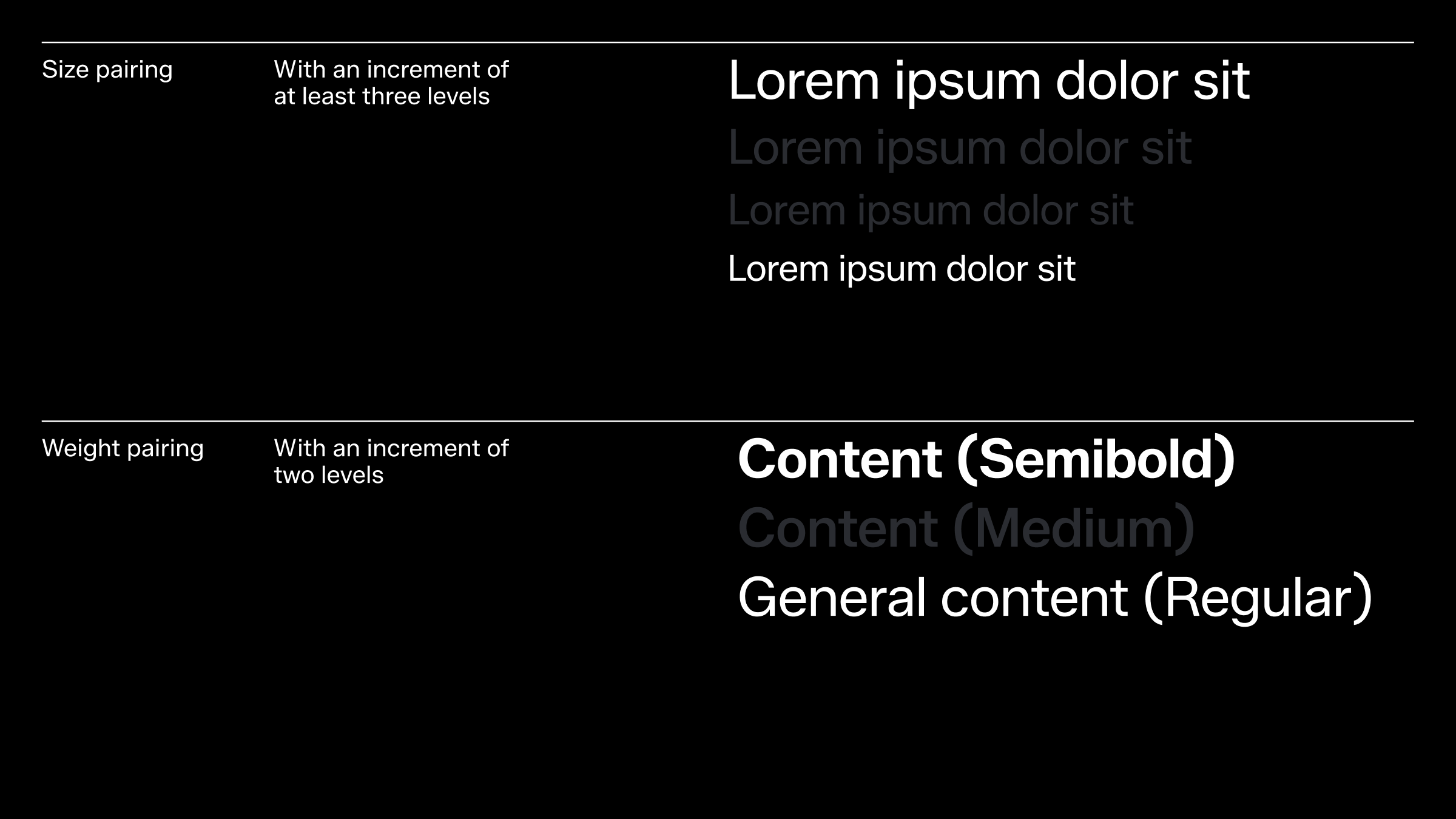 Weight Pairing: Use type weights with a two-level difference, like transitioning from Regular to Semibold.