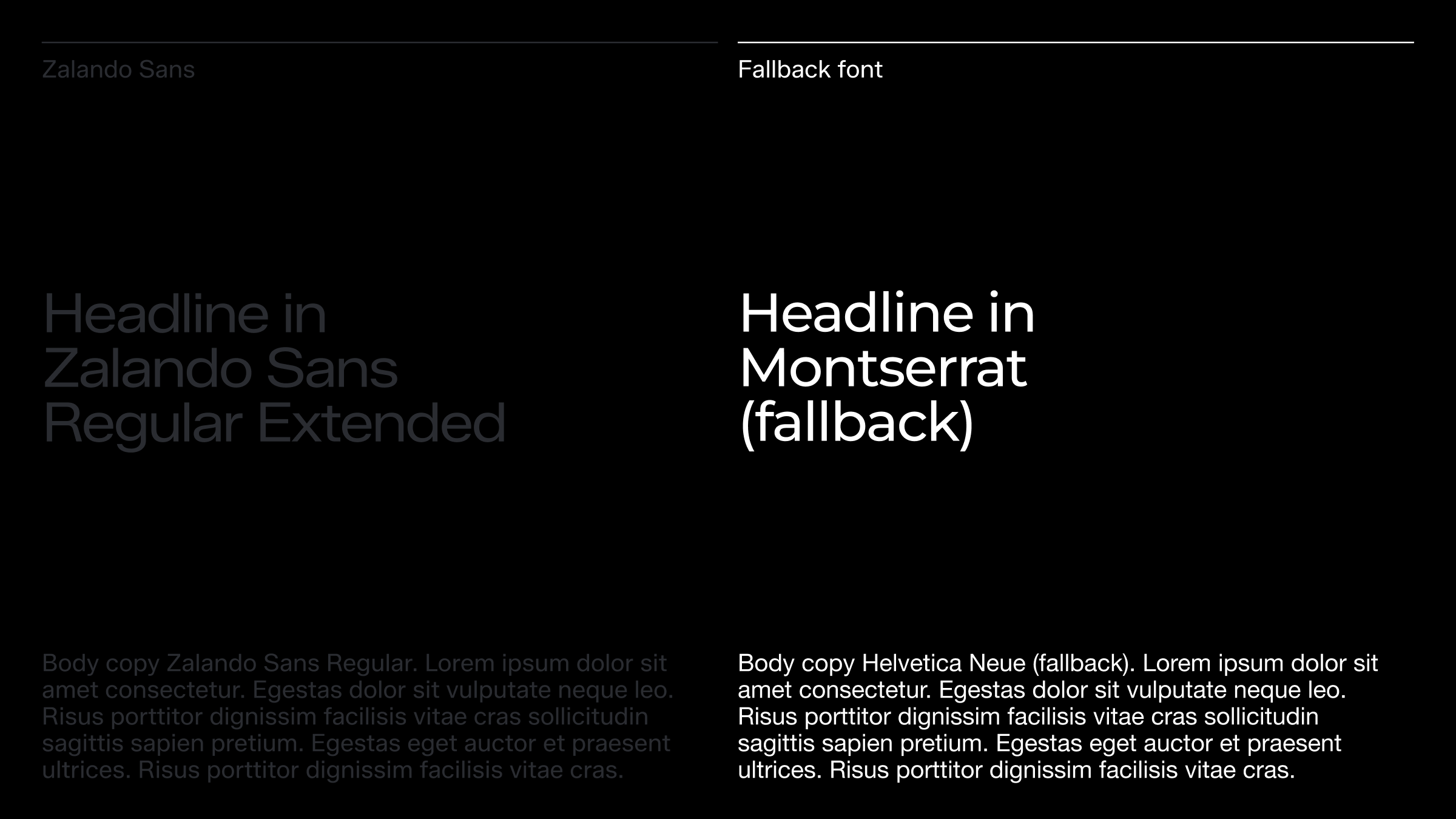 Zalando Sans is one of our most powerful brand assets and should be used wherever possible within the organisation. However, when a system font is needed—one that requires no special license and is universally available—Montserrat is designated for headlines, and Helvetica Neue for body copy. Additionally, Helvetica is our fallback option for emails, as it is considered a reliable choice.