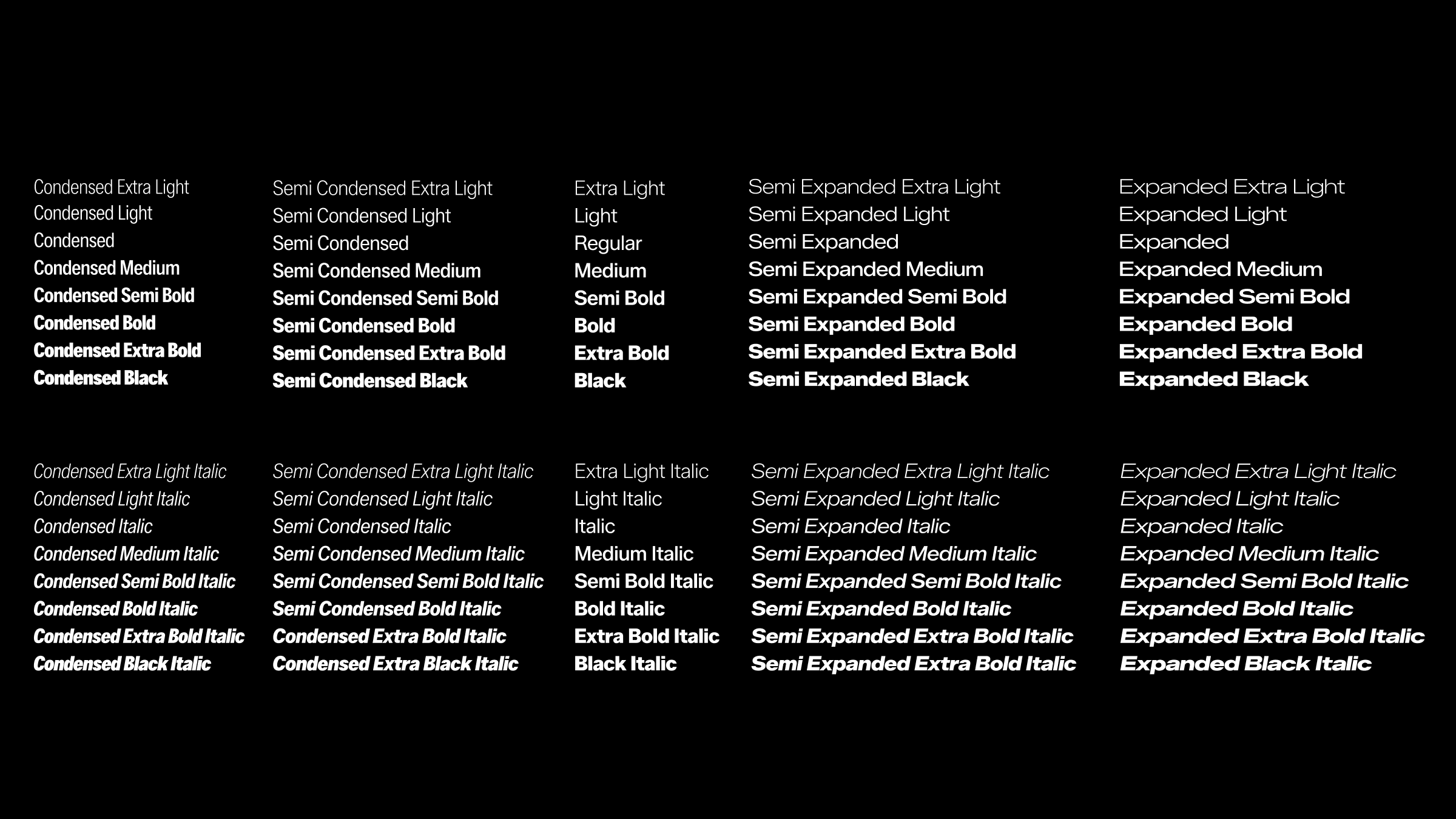 The Zalando Sans typeface is a variable font that ranging from Condensed Extra Light to Expanded Black. This versatility allows us to meet a wide variety of design needs. Below is an overview of the available weights.