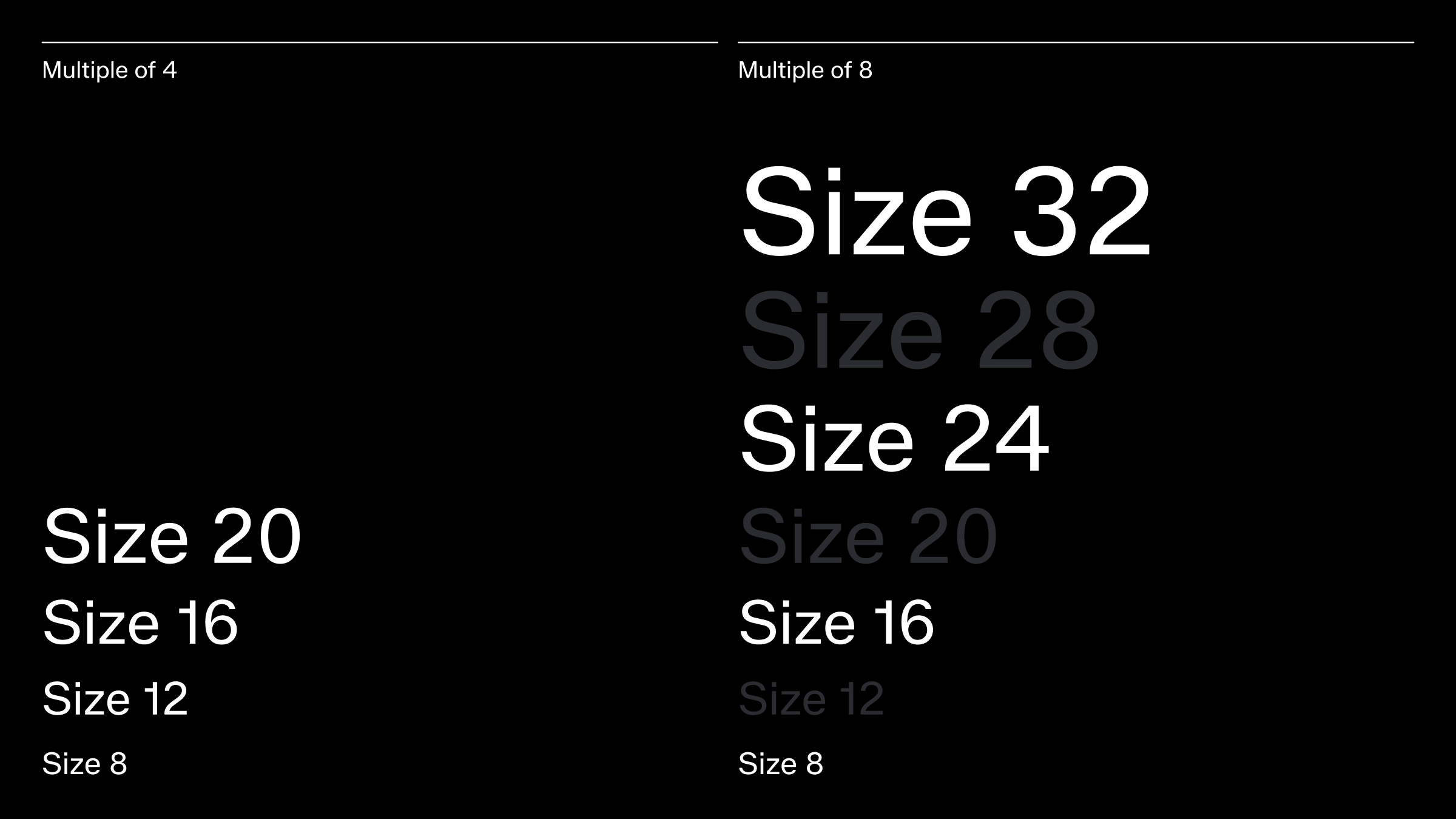 Across both brand and digital touchpoints, sizes are guided by the same principles, using increments of 4 and/or 8. While it’s possible to base the scale on a different starting point, it’s essential to recalculate the scale accordingly.