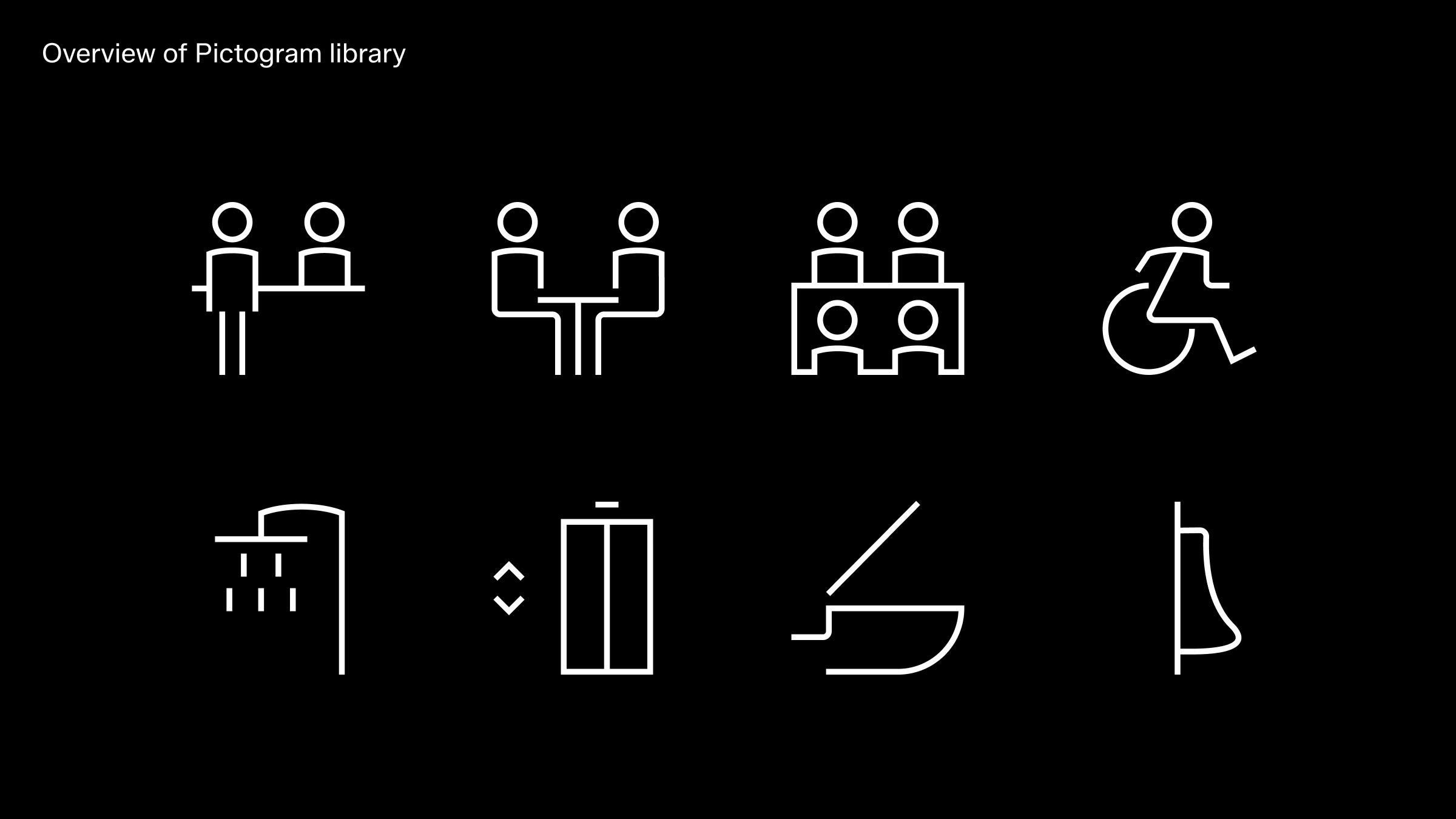 Like the UI icons, our pictograms are rooted in the same visual DNA and design principles. However, they serve a different purpose, functioning as wayfinding elements with a more decorative quality.